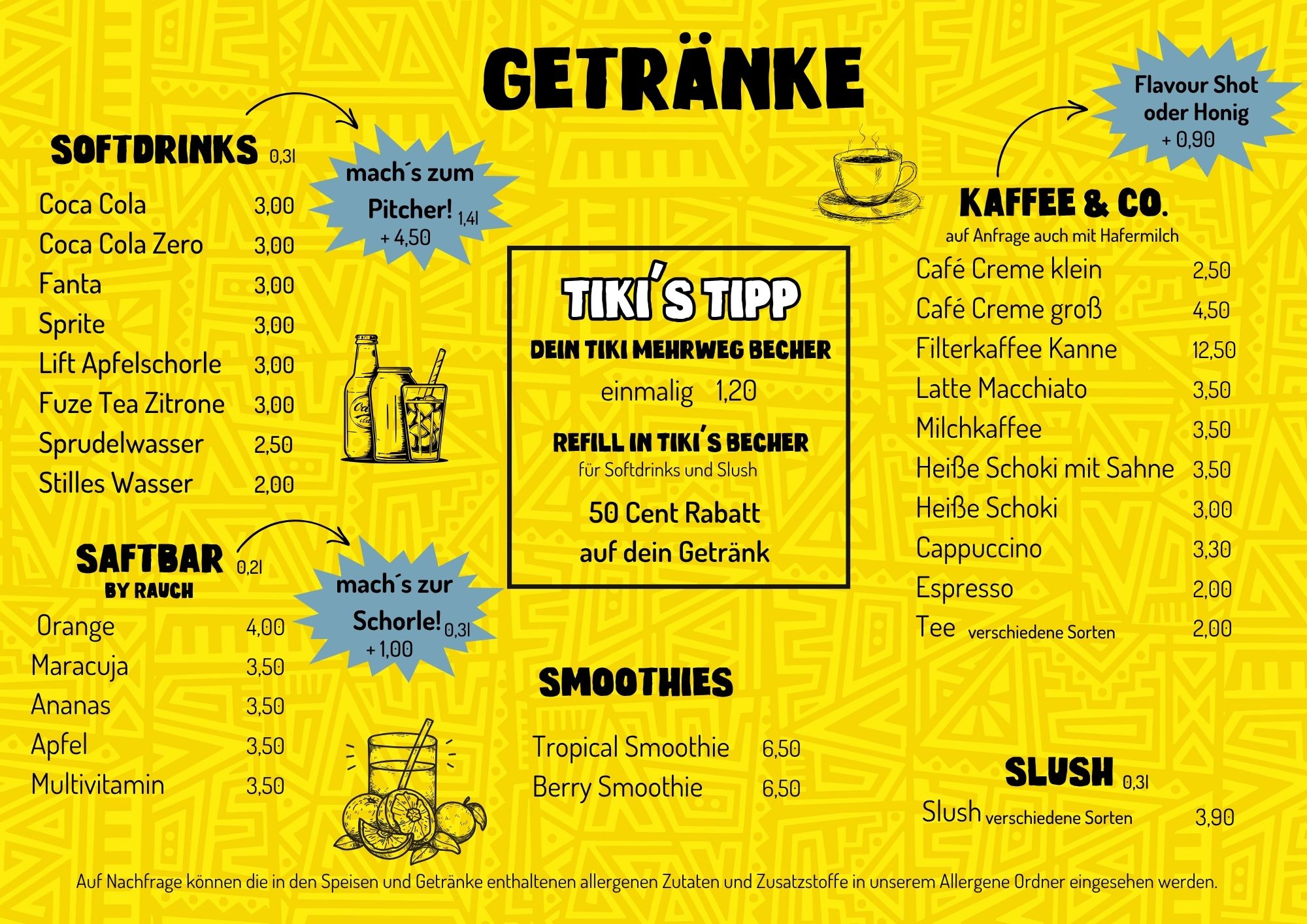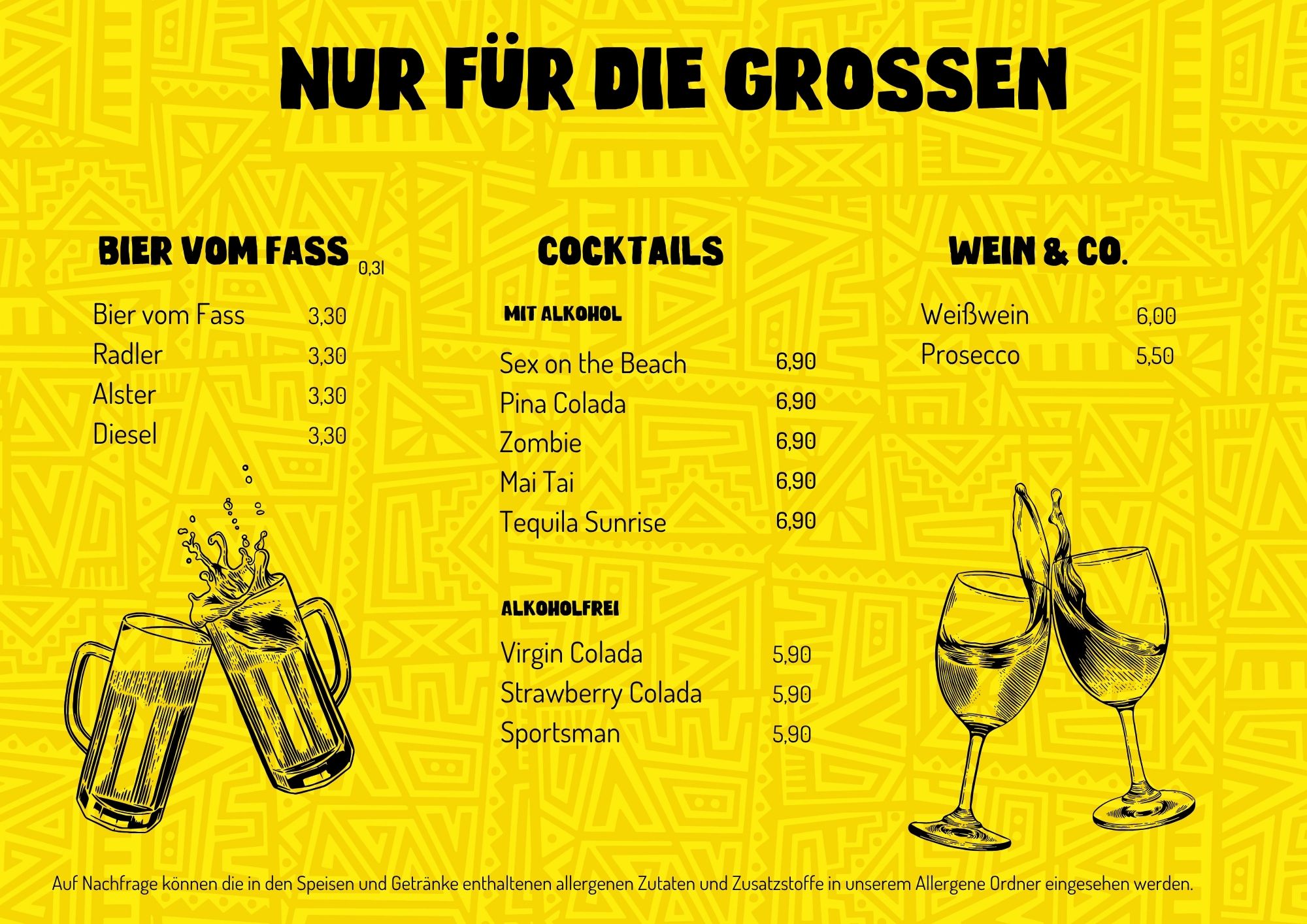 Das Angebot in unserer Bamboo-Bar ist für kleine und große Seeräuber und Meerjungfrauen ausgelegt. Für jeden Geschmack ist genau das Richtige dabei. Genießt unsere Kaffeespezialitäten, Softdrinks, Säfte, Cocktails, Speisen und Leckereien zu günstigen Preisen in Südsee-Atmosphäre. Besonders beliebt ist unsere große Eisinsel.