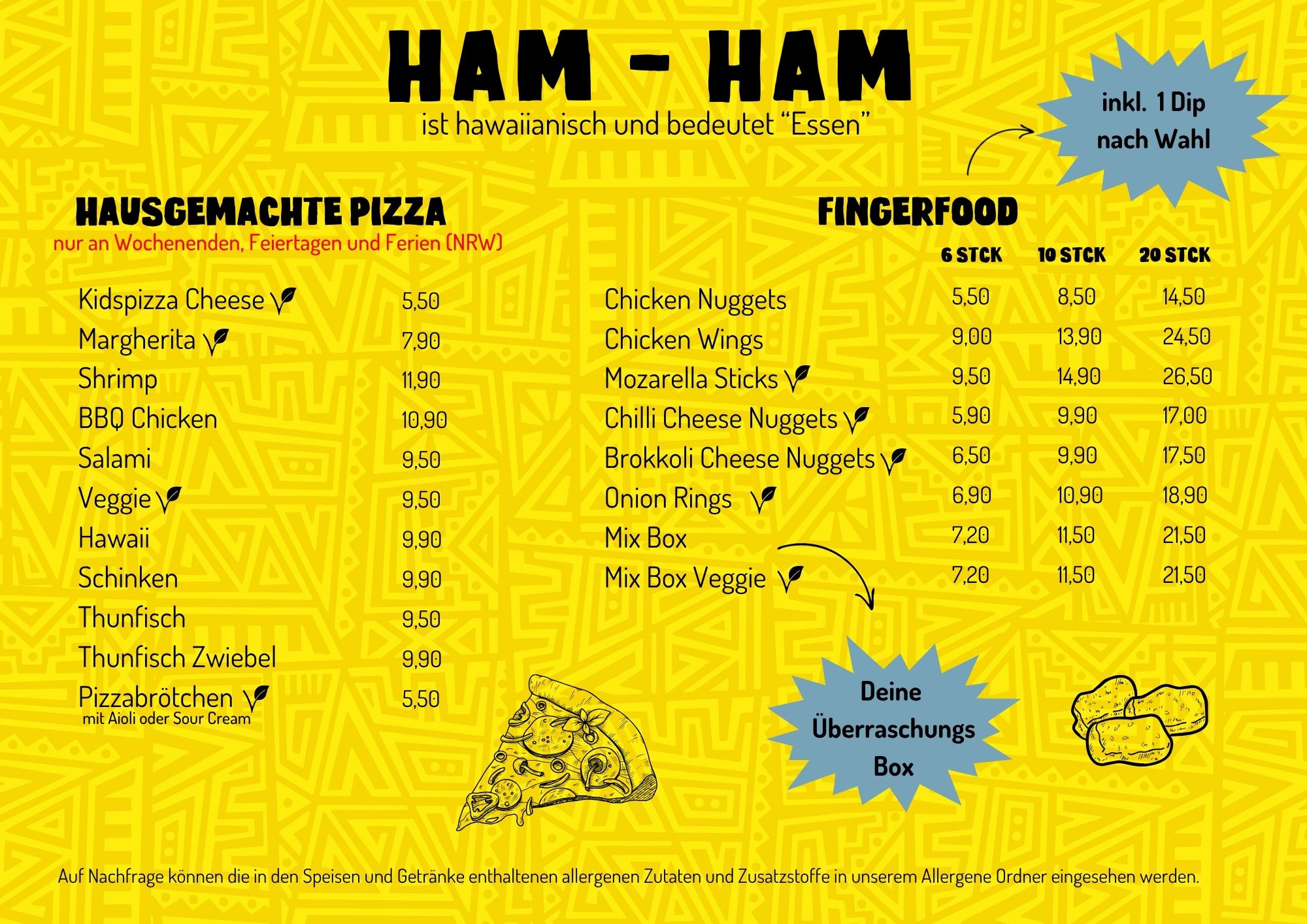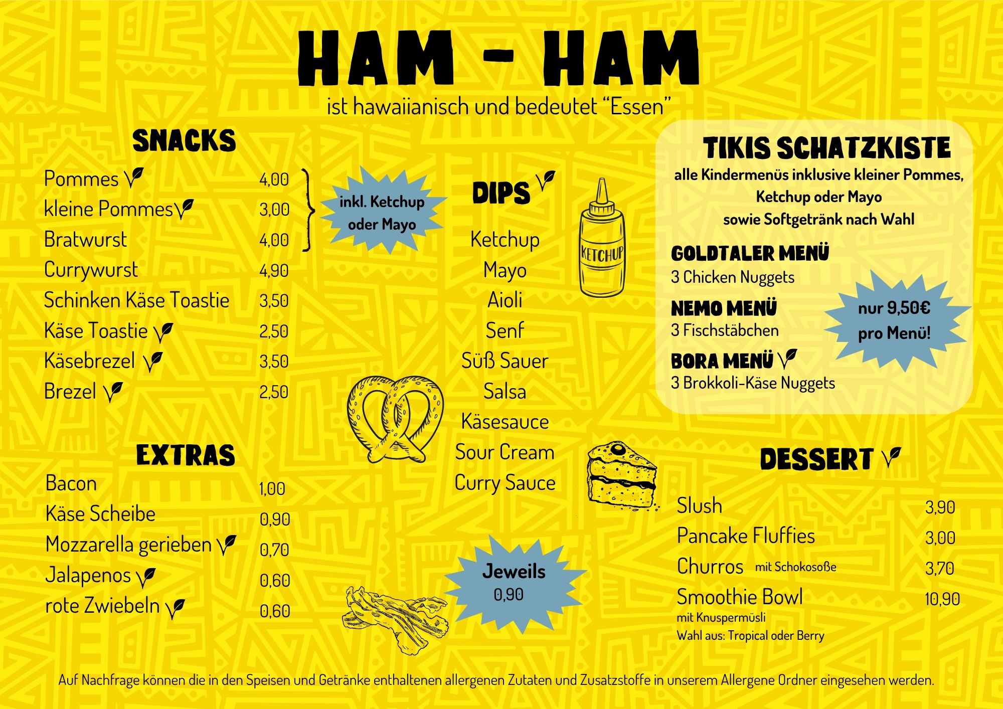 In unserer BAMBOO – BAR gibt es “HAMHAM“ (Ham Ham ist hawaiianisch und bedeutet Essen.) In unserer familienfreundlichen Bamboo-Bar versetzen wir Euch in Urlaubsstimmung. Durch unsere großen Panoramafenster habt Ihr Ausblick auf die Außenwelt, sowie auf “unser“ Meer mit Tiki-Insel.